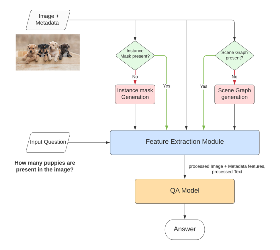 Our proposed VQA system takes as input an image, its corresponding meta-data, and an associated question.