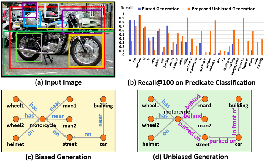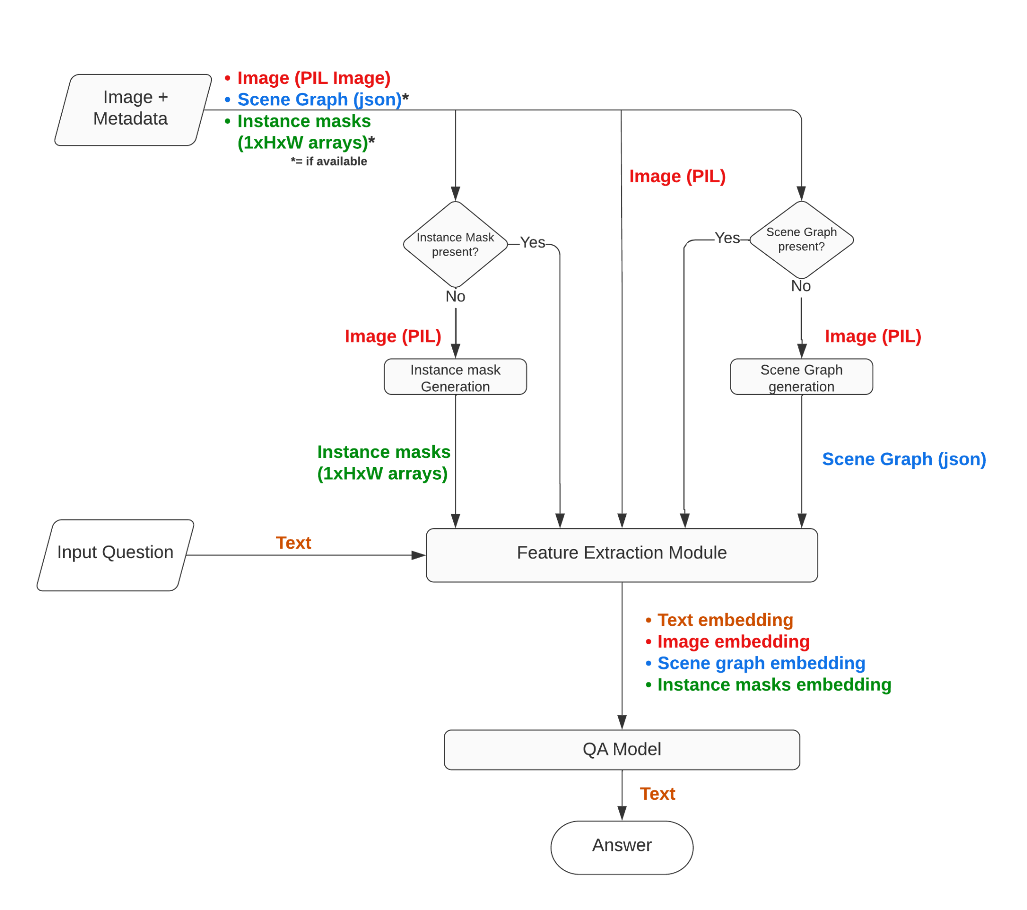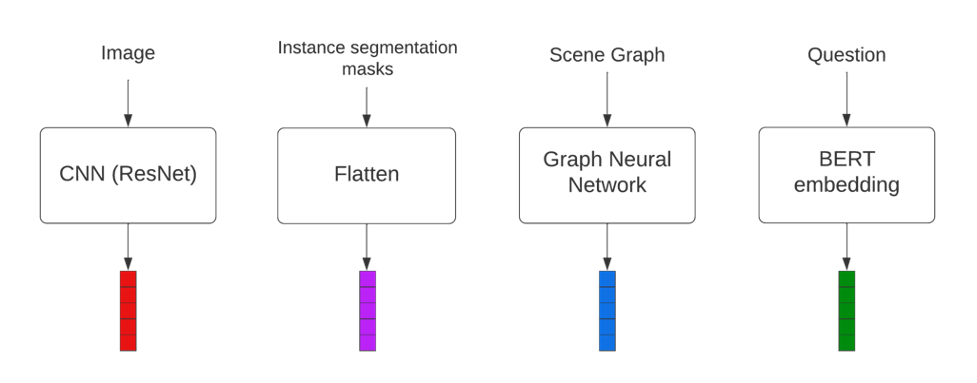 Scene graph generation module is responsible for generating a scene graph for the image if that is not provided as an input. Scene graphs represent visual scenes as objects and their attributes as nodes of the graph and the relationships between them as edges.