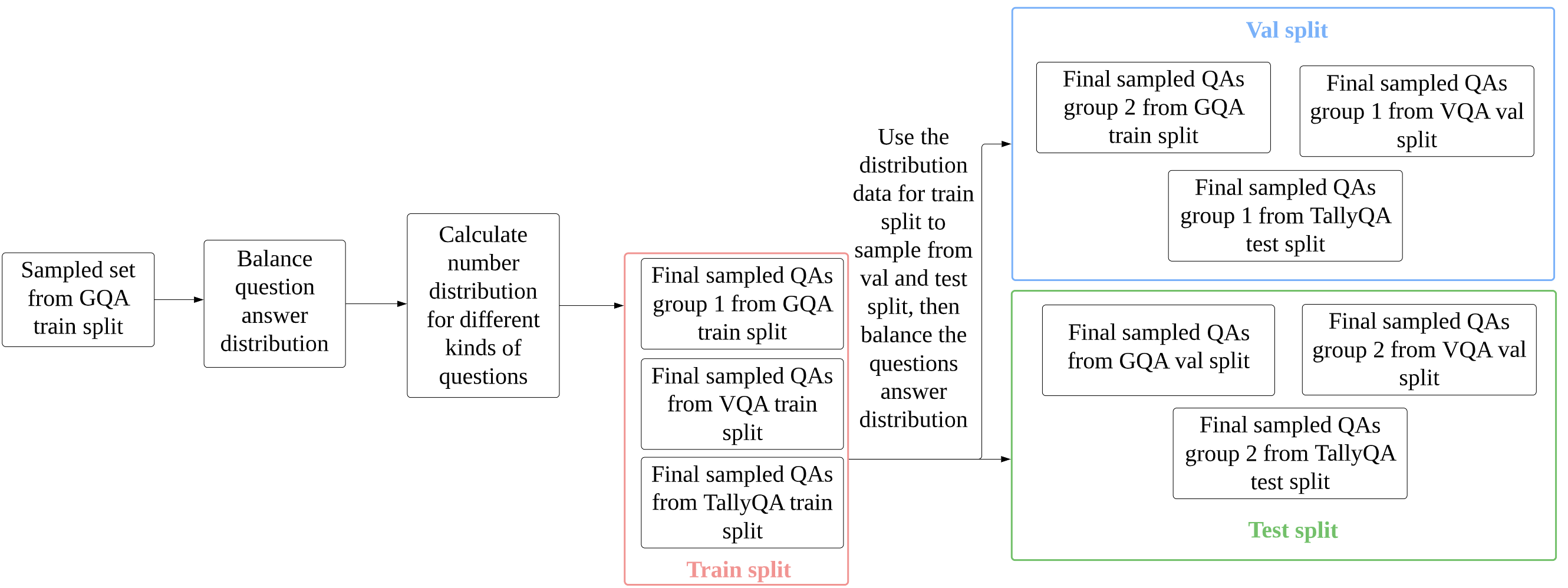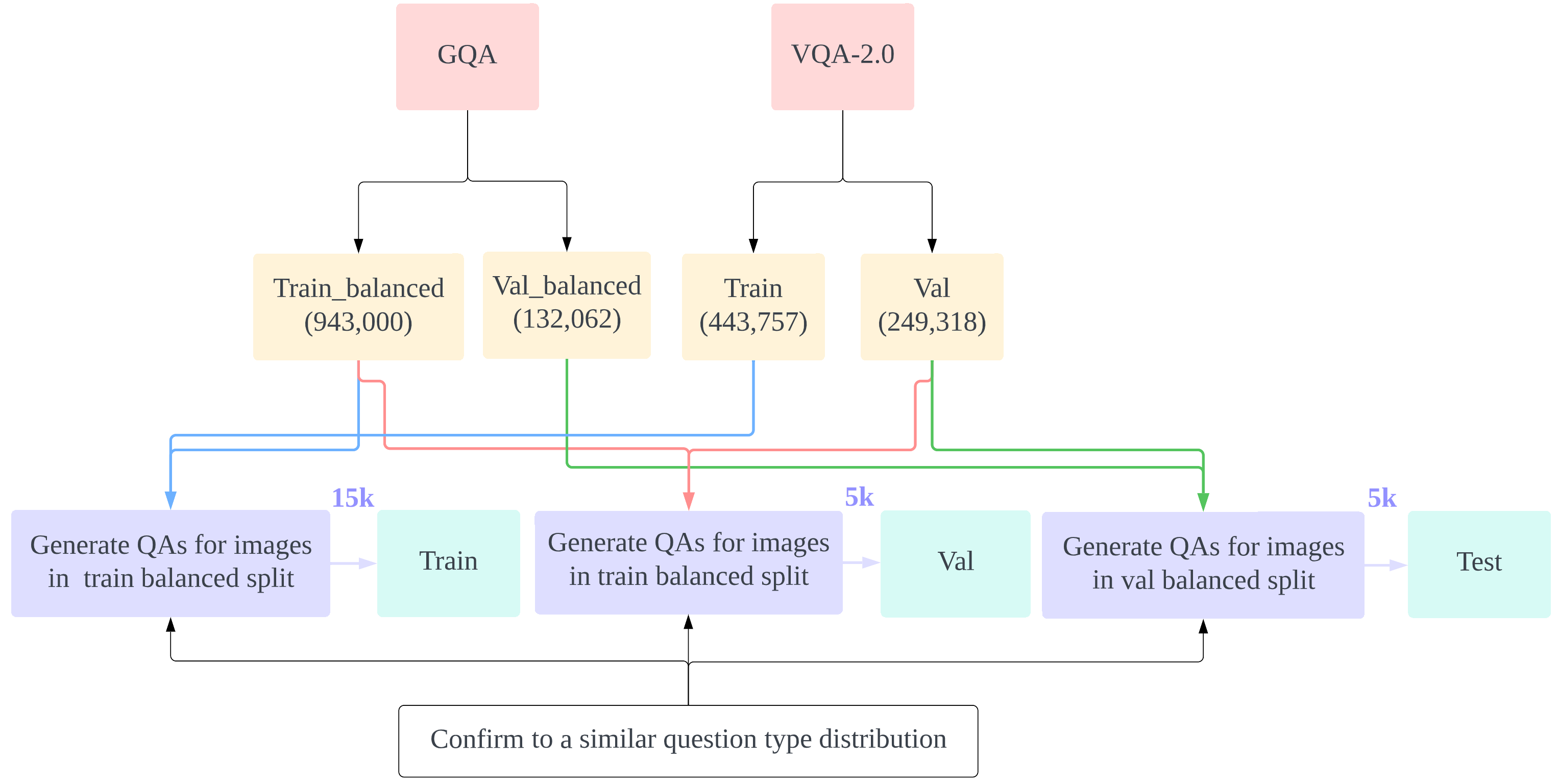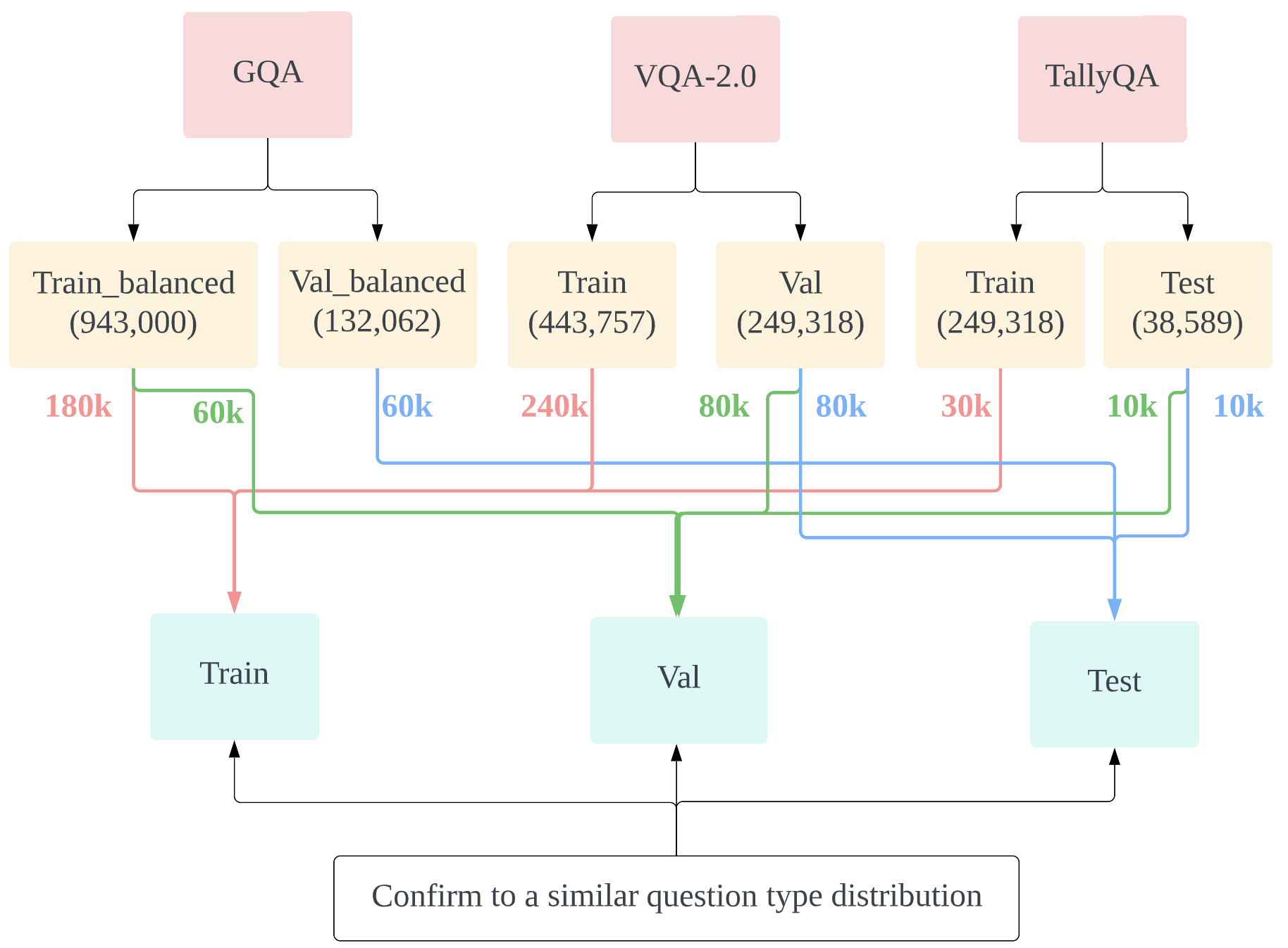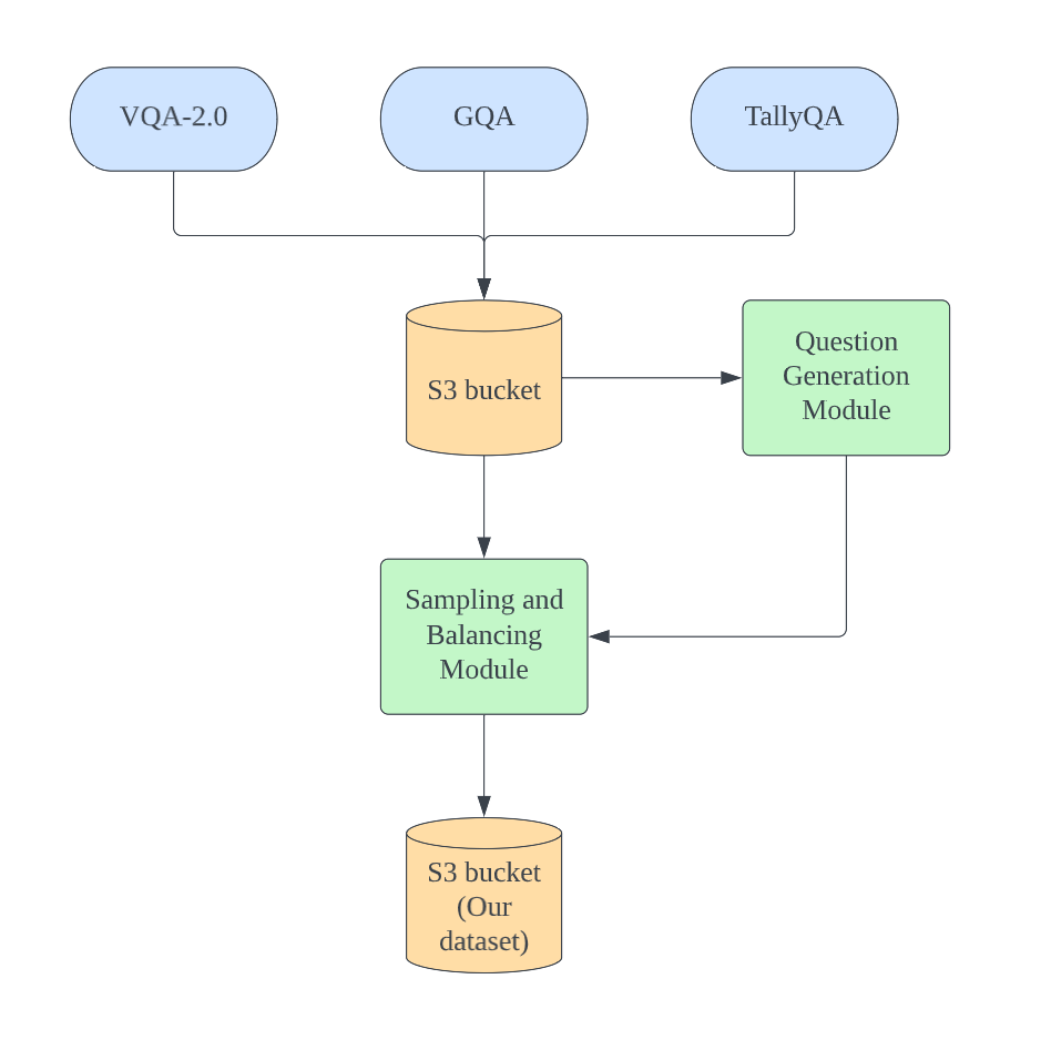 The question generation workflow summarizes the process of our sampling and balancing process on GQA, VQA-2.0 and TallyQA.
