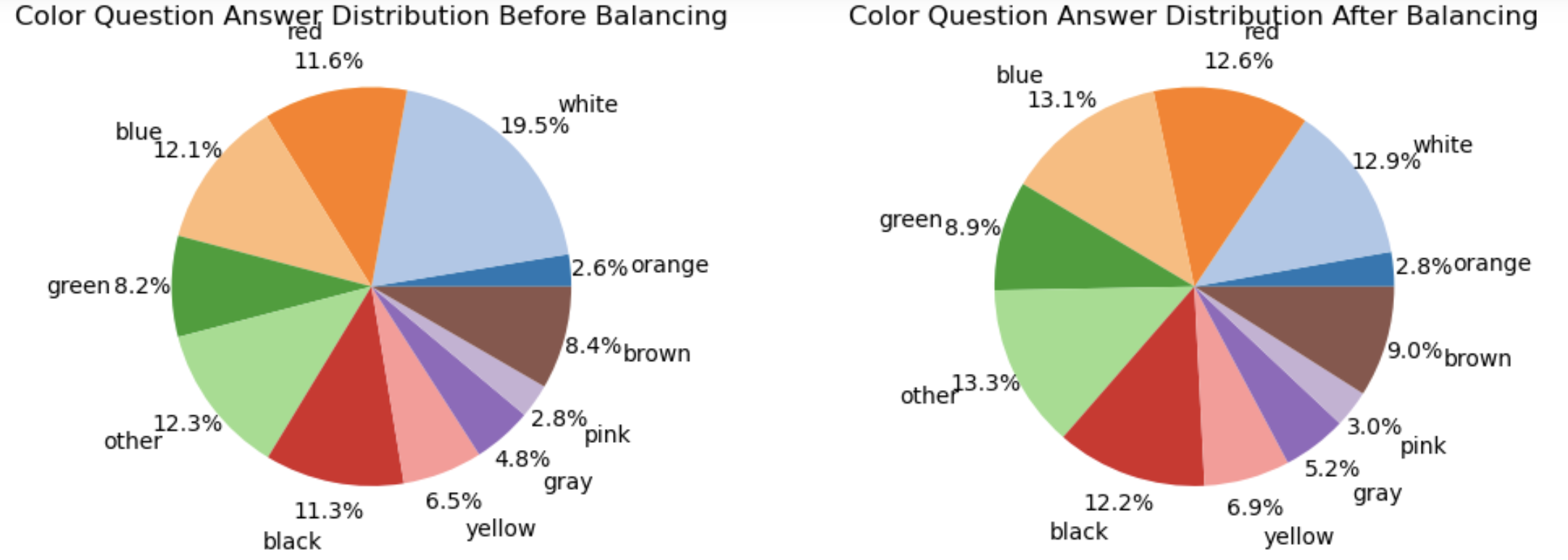 Comparison of our question balancing result on VQA-2.0 train split’s color questions.